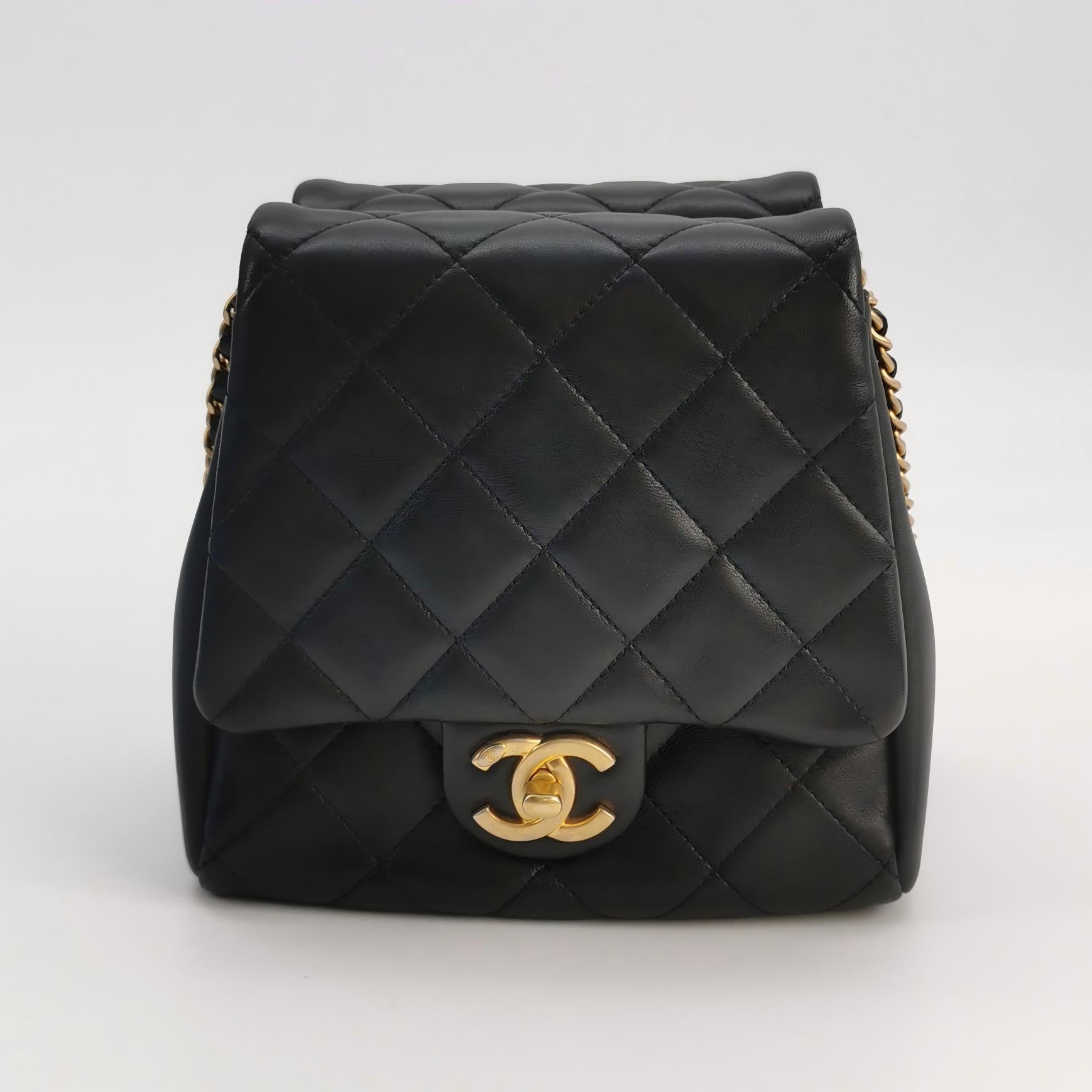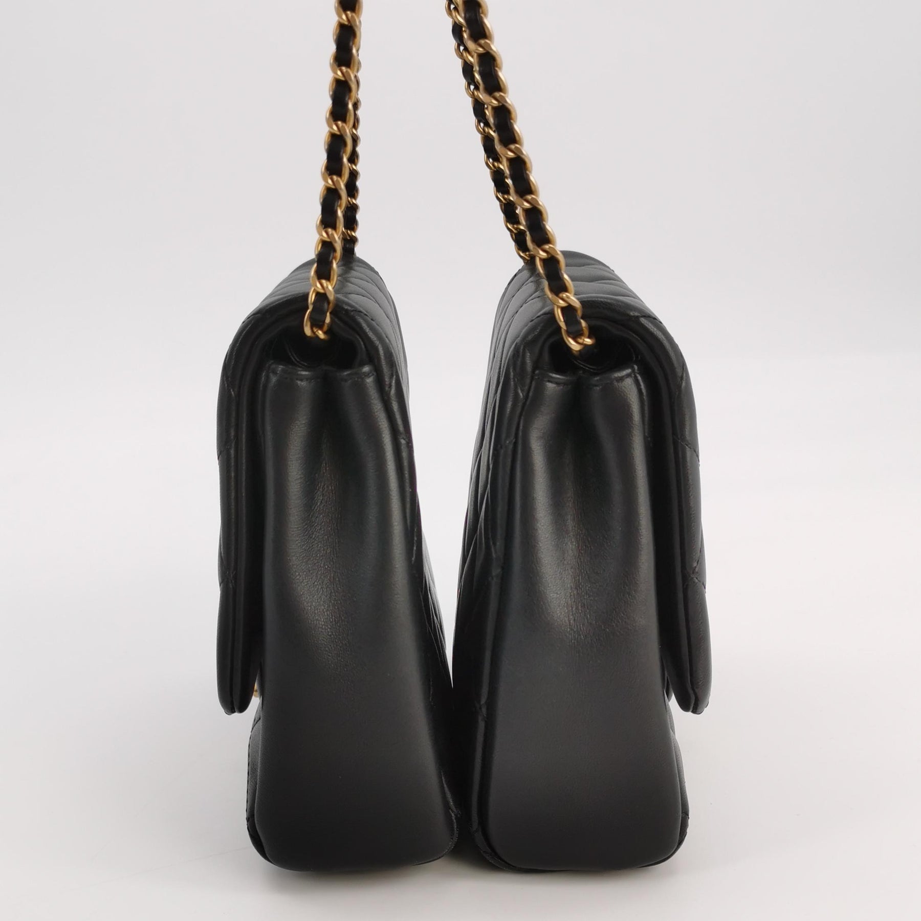 Exterior: Buttery soft, black diamond-quilted lambskin leather (Offering an incredibly luxurious, supple touch across both twin bags)