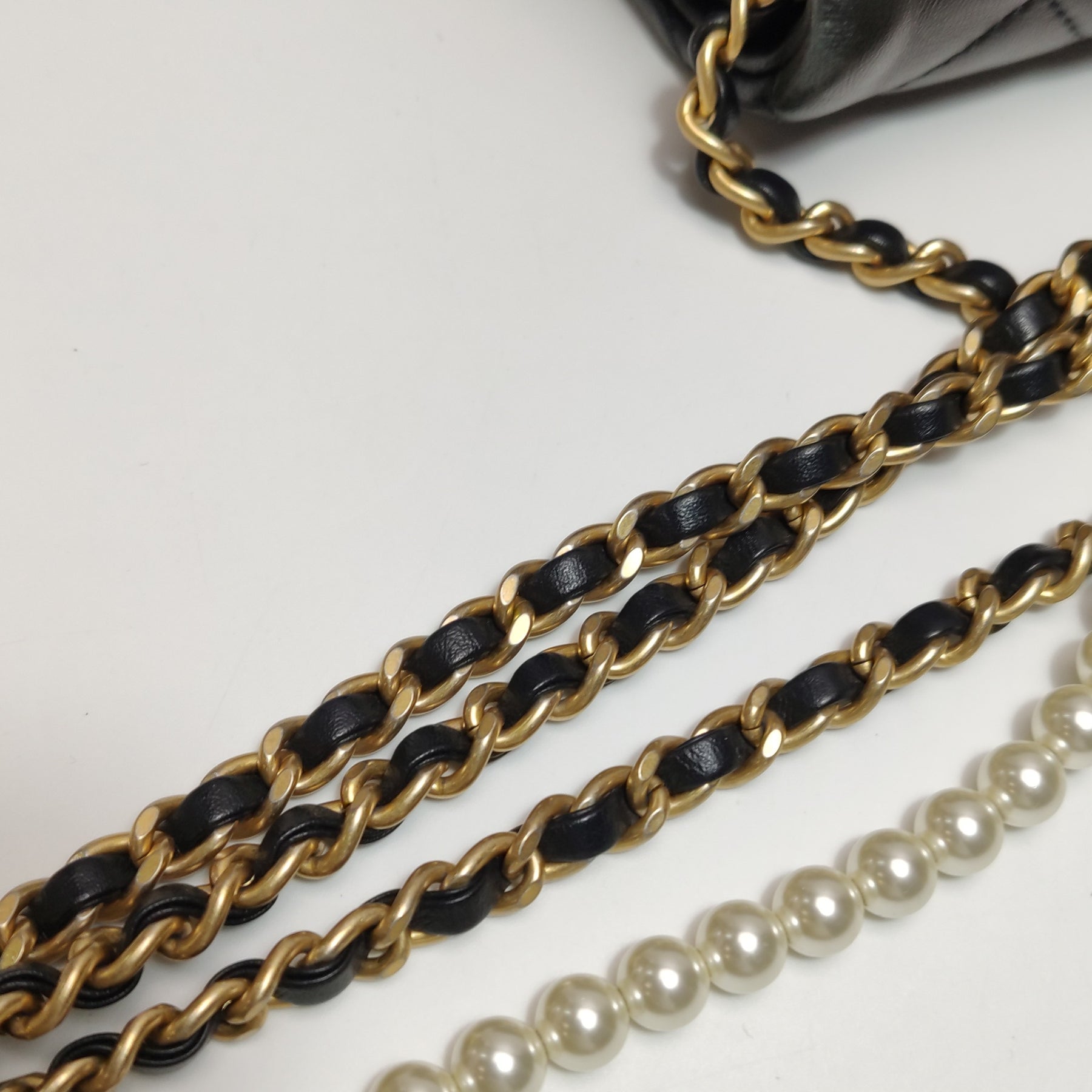 Hardware: Classic gold-tone hardware featuring an ingenious interwoven leather chain, beautifully interlaced with exquisite faux pearls (Adding a brilliantly opulent, vintage-inspired warmth to the deeply modern, symmetrical silhouette)