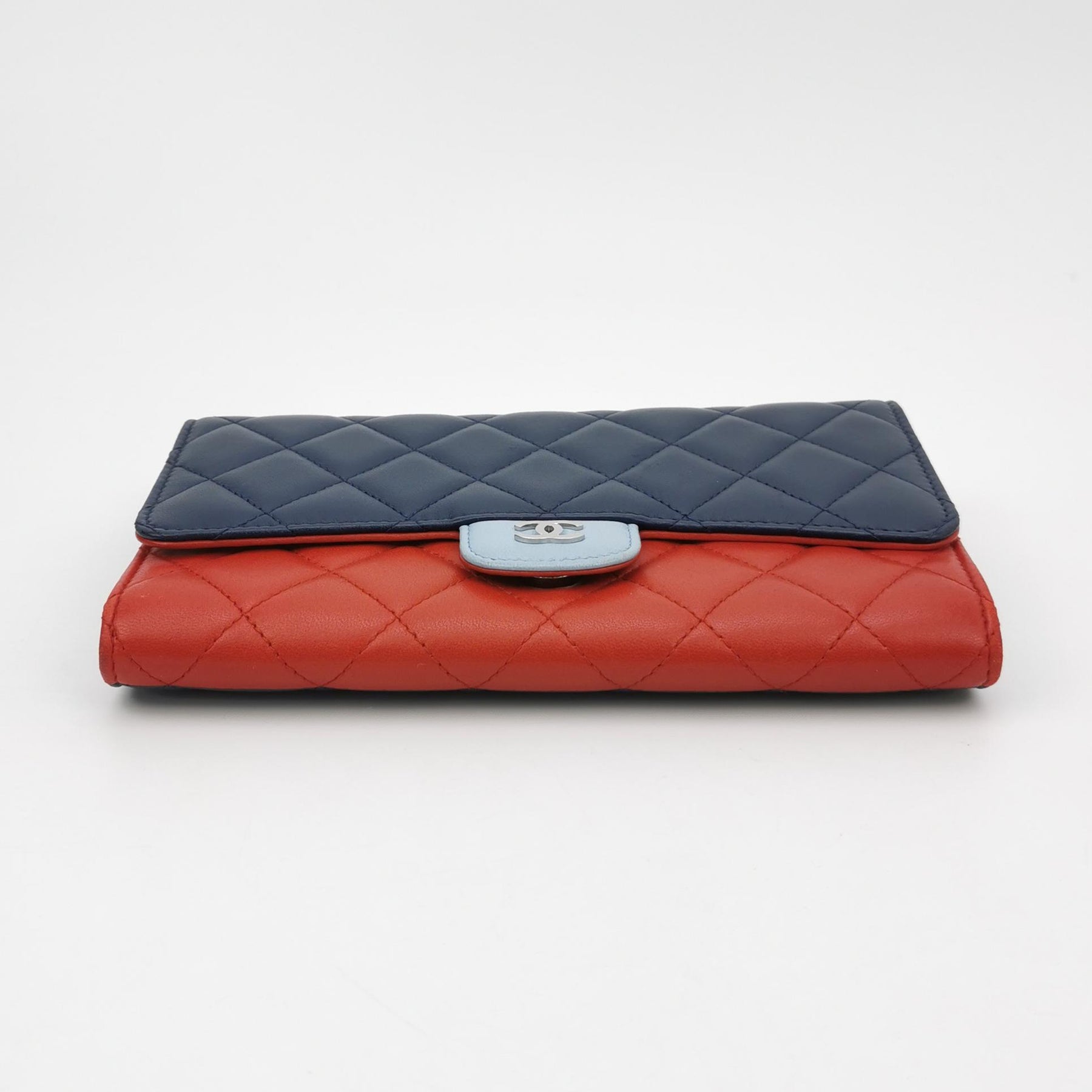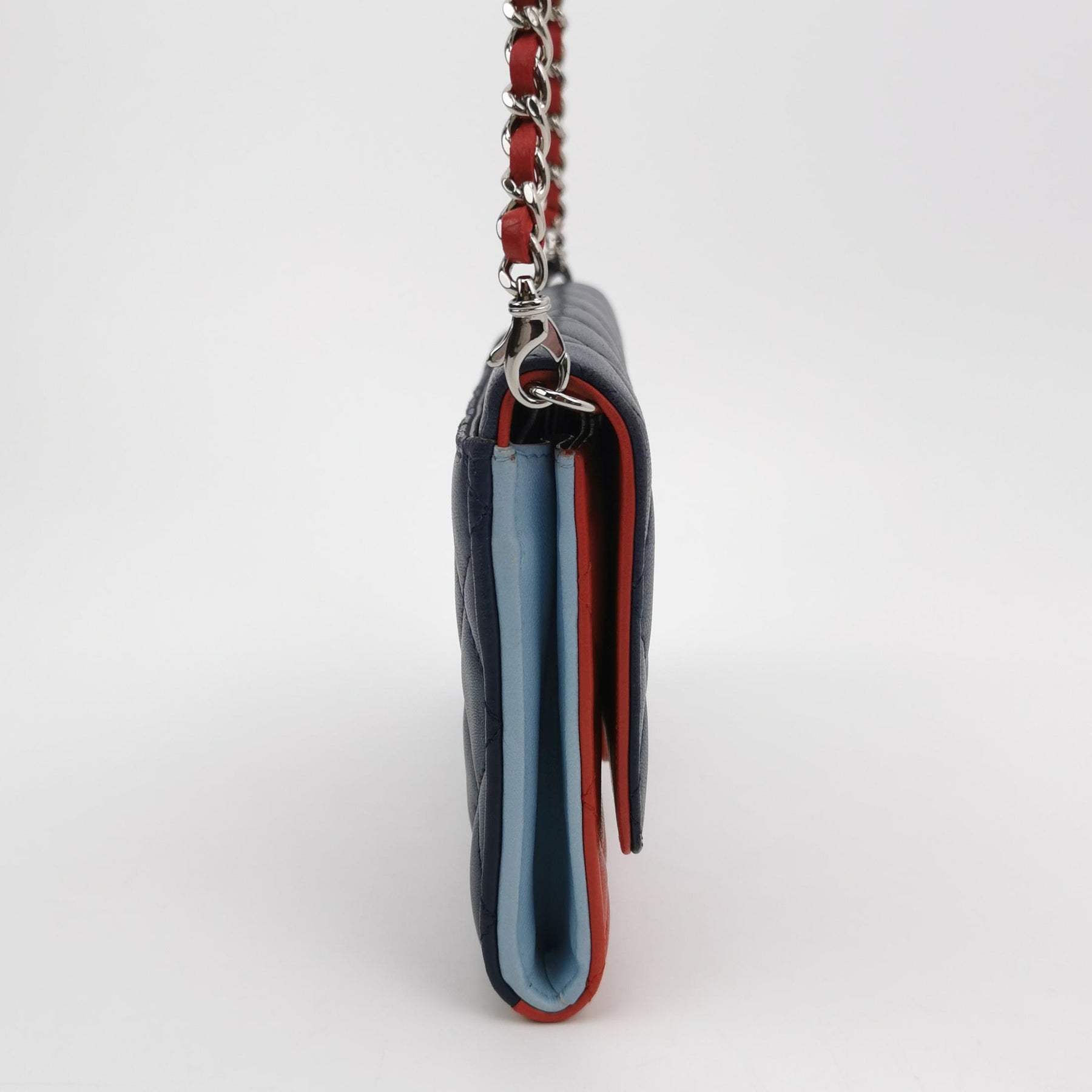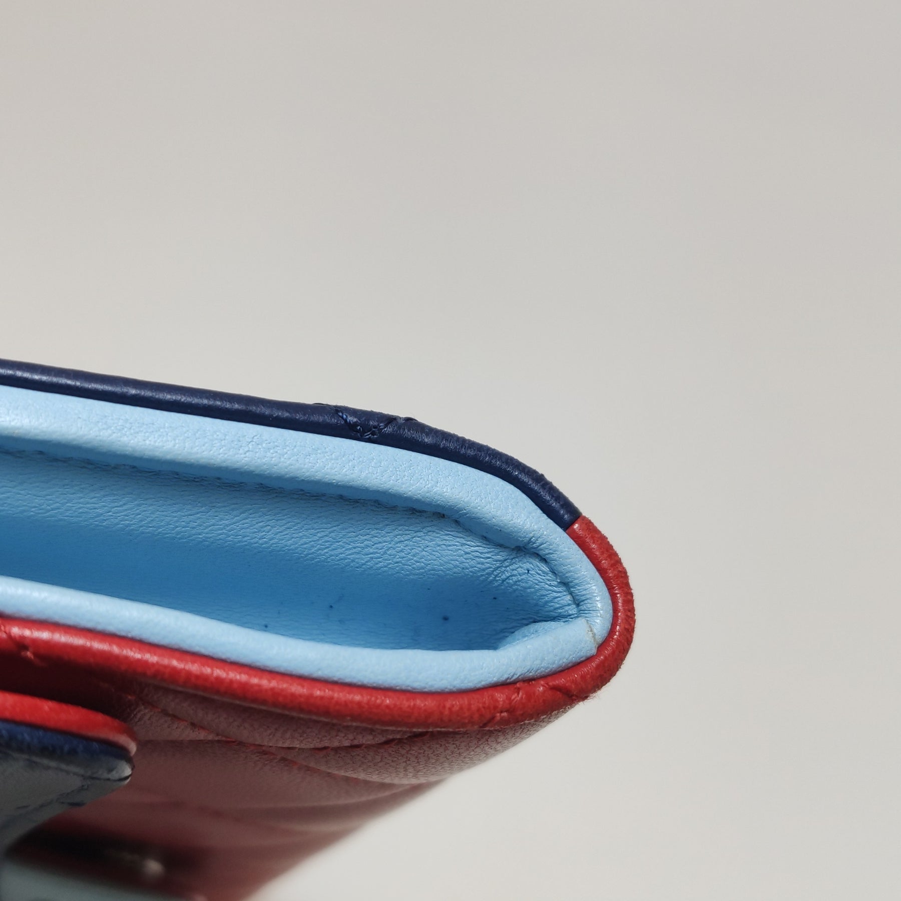 Exterior: Exquisite tri-colour Quilted Lambskin Leather. Featuring a Navy Blue flap, a Cherry Red body, and a unique Light Blue leather-inlay CC tab. The lambskin is renowned for its buttery-soft feel and luxurious, fine-grained texture.