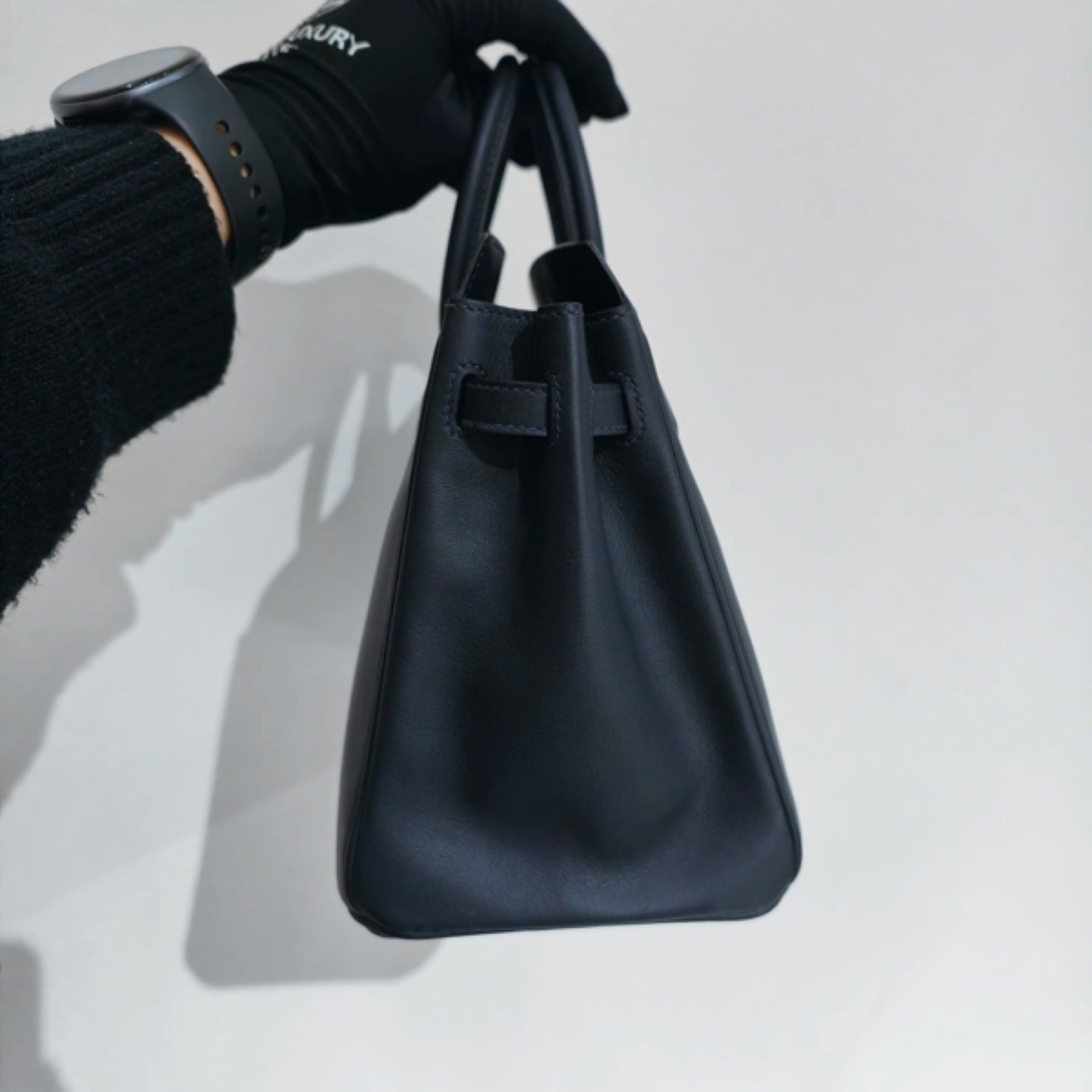 Strap: Sturdy, double rolled leather top handles designed for graceful hand or crook-of-the-arm carry.